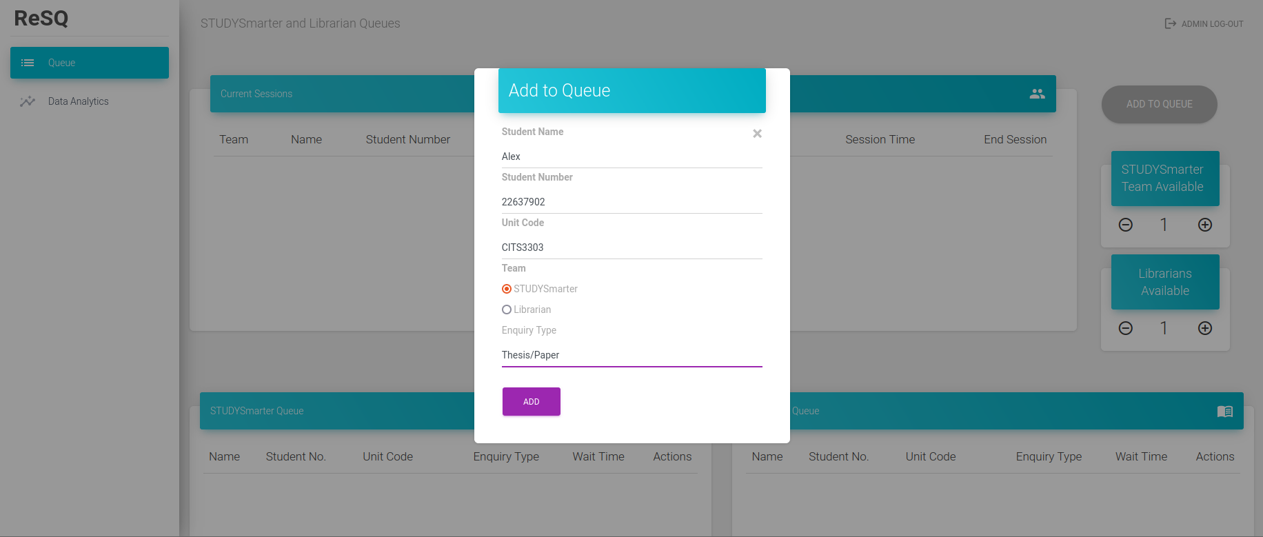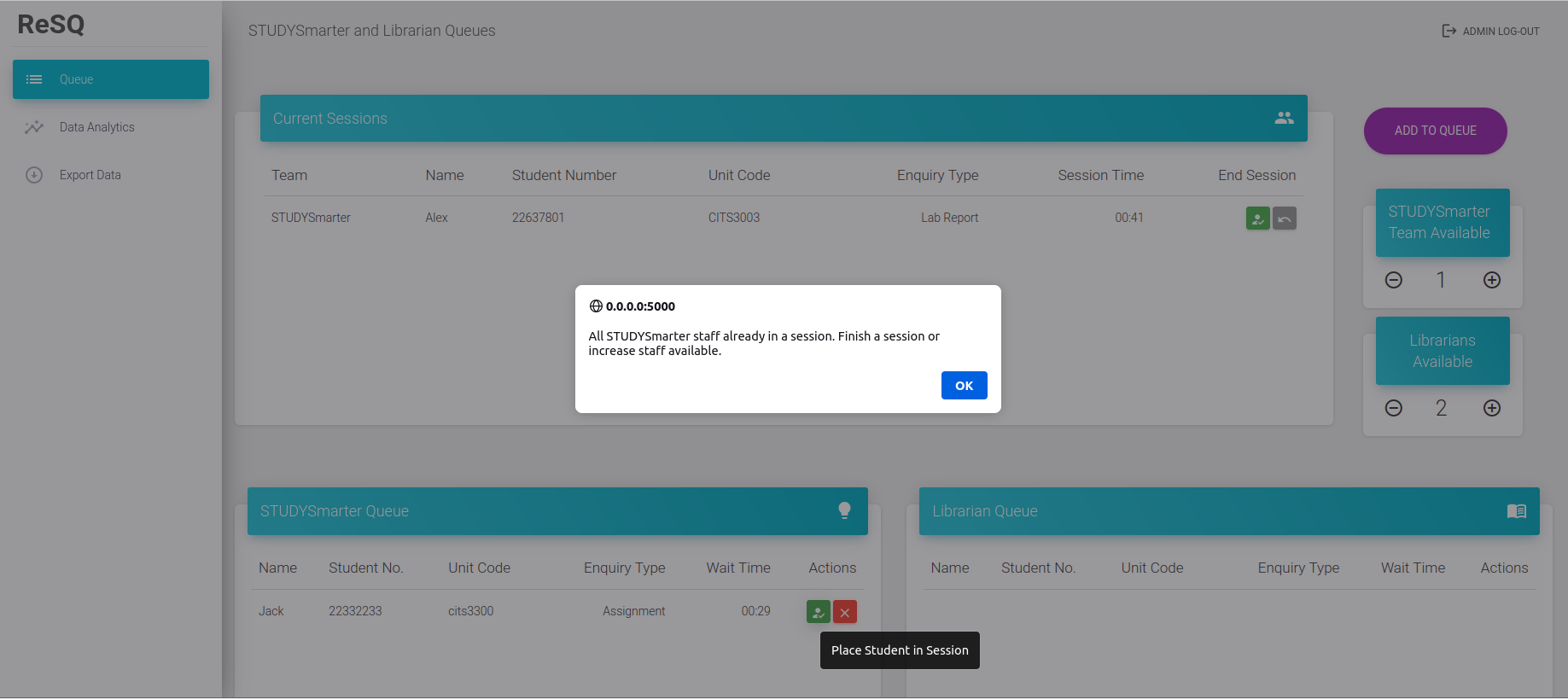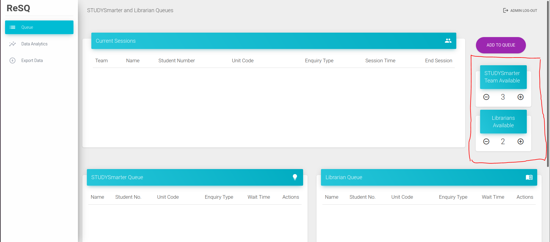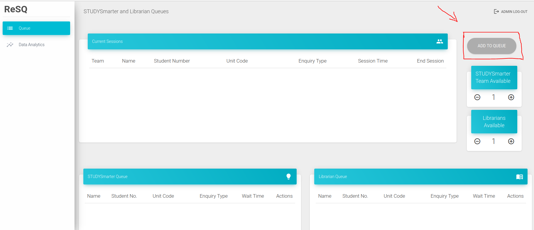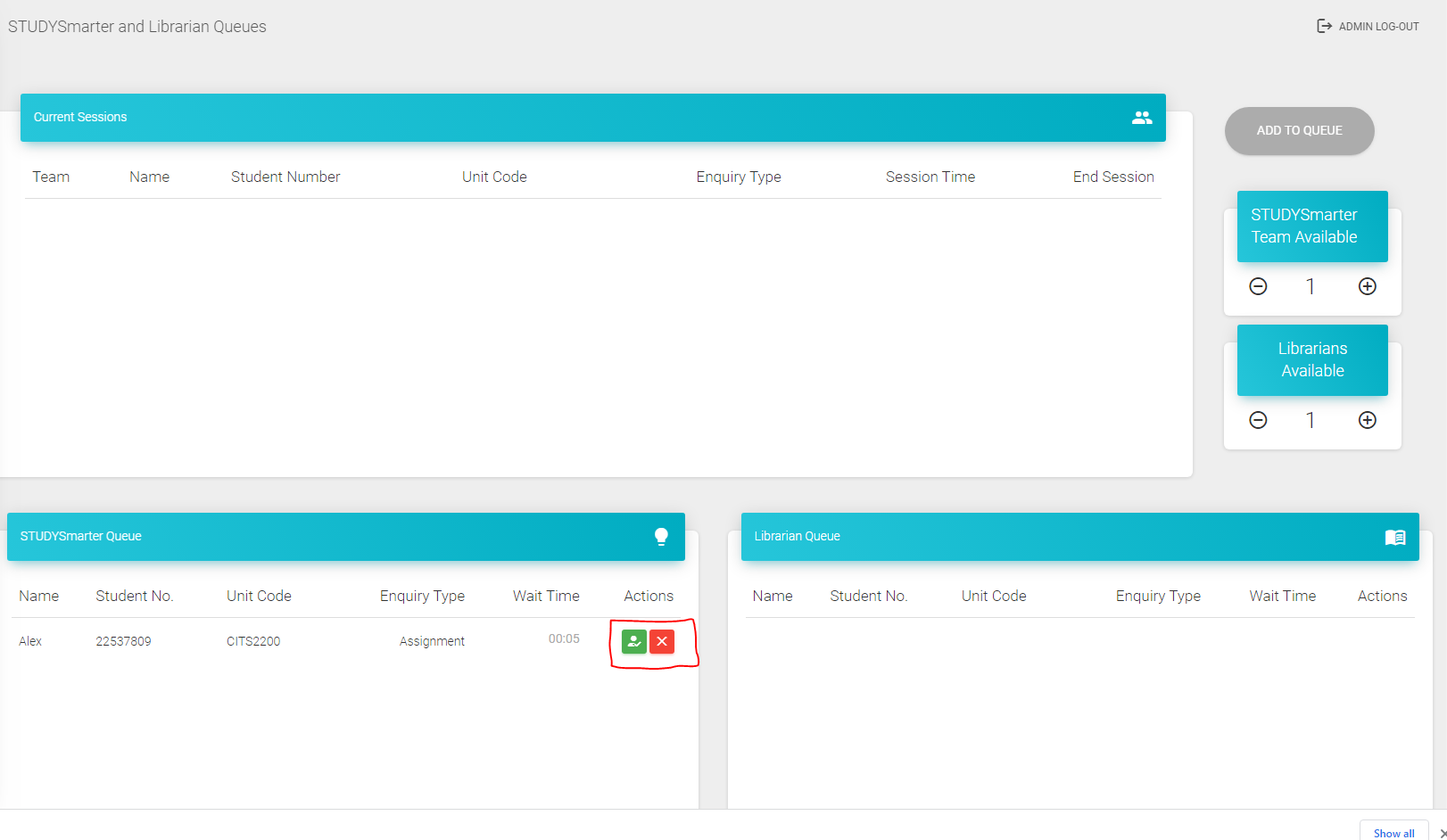 User can manage student sessions in the Queue tab. There are 3 tables, 2 of which are STUDYSmarter queue and Librarian queue. Students will be put into either queue depending on user's choice.