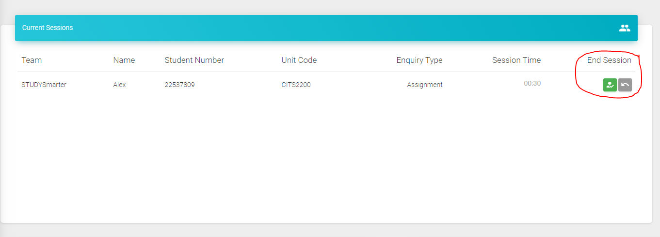 If you want to move students from either waiting queue to "Current Session" table, click the green button in the "Actions" column